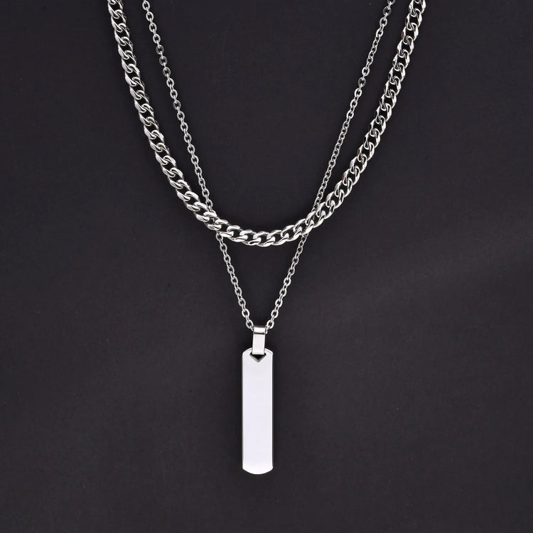 Two chains. One presence. A bold combination of Cuban and rope textures finished with a sharp vertical bar pendant for structured edge.